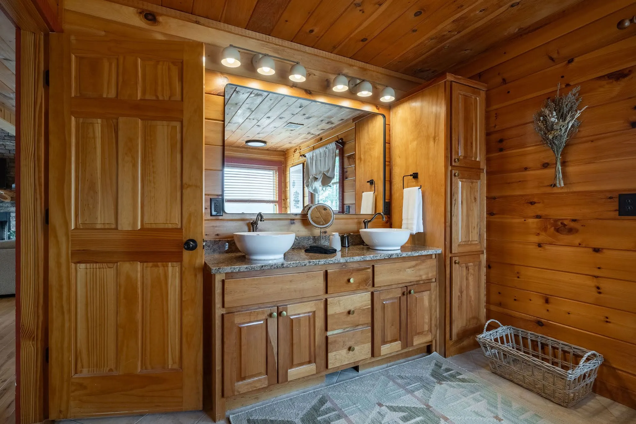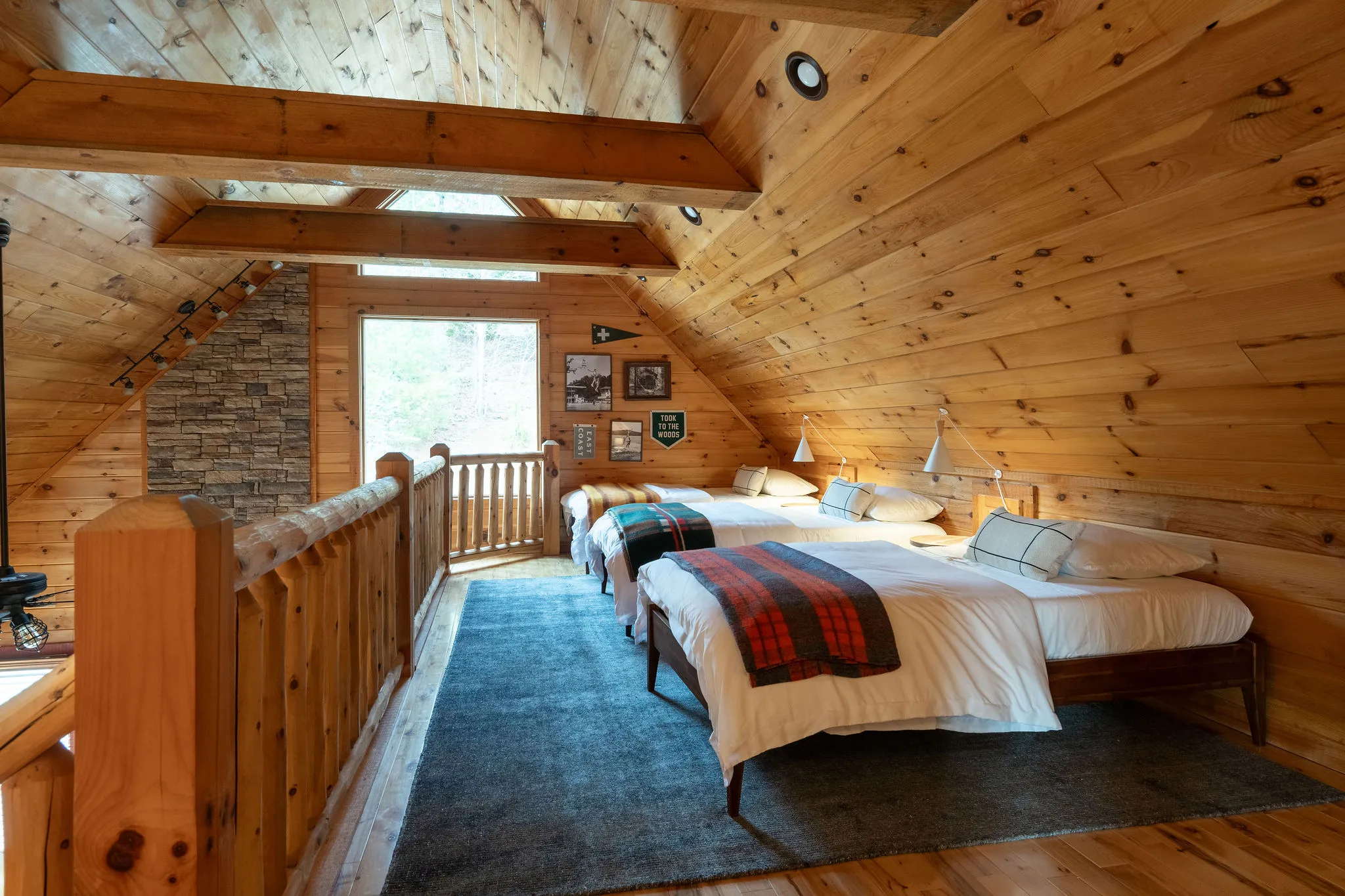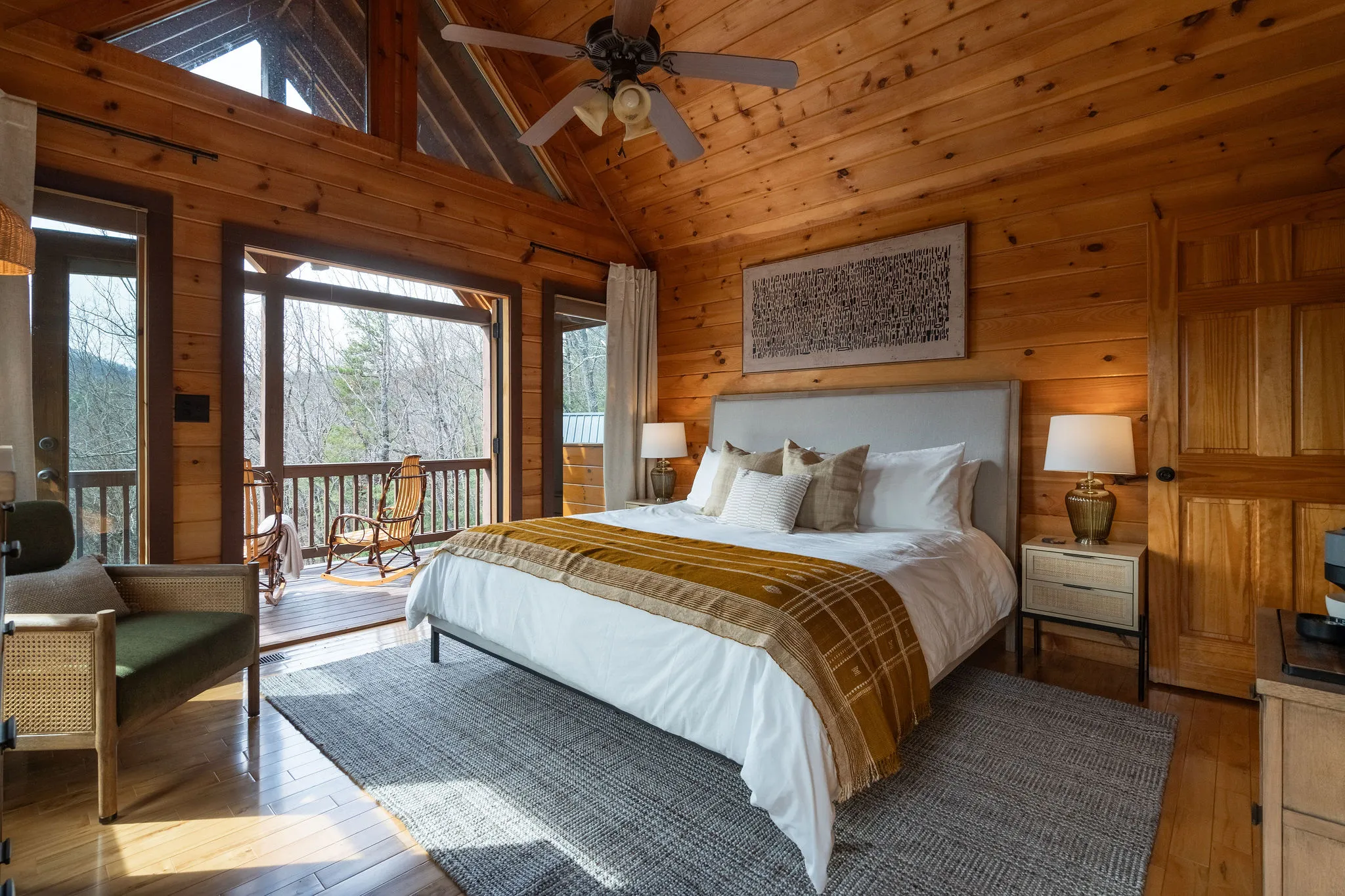 UPPER LEVEL A twin sleeping loft for three brings camp nostalgia, while a king bedroom includes a private coffee station and porch for quiet mornings with stunning mountain views. A full bathroom with a tub and shower completes the space.