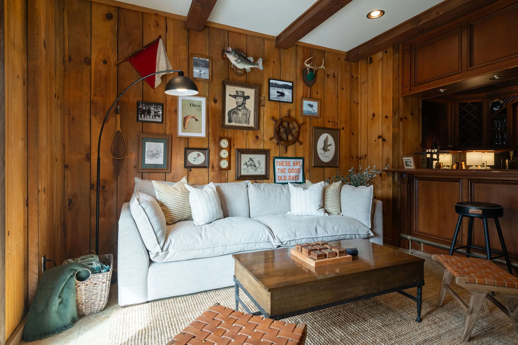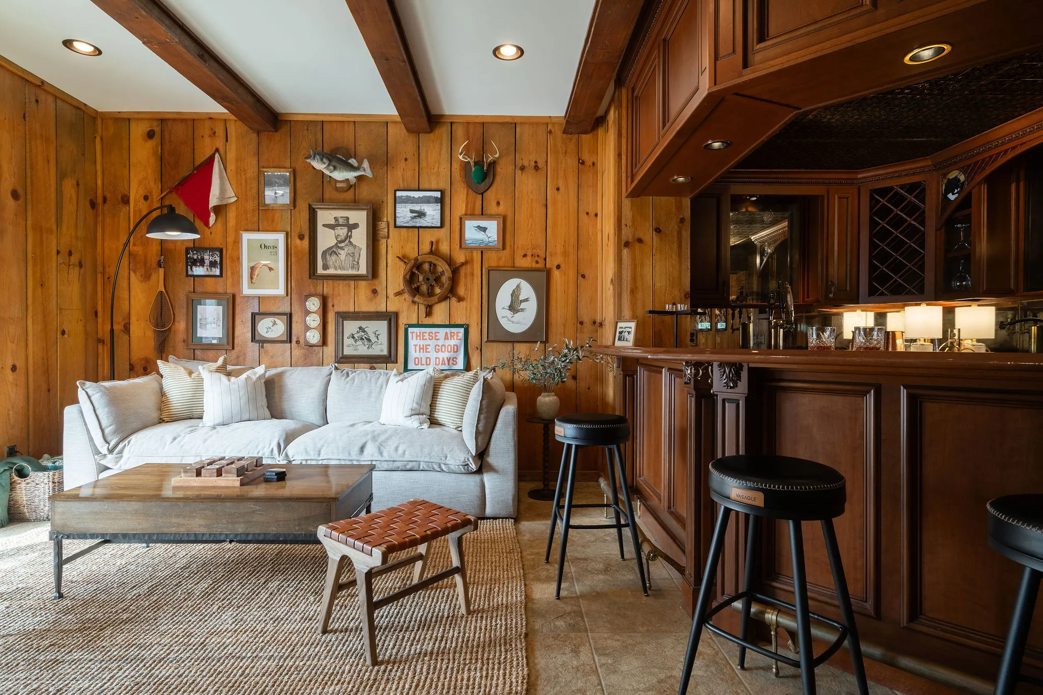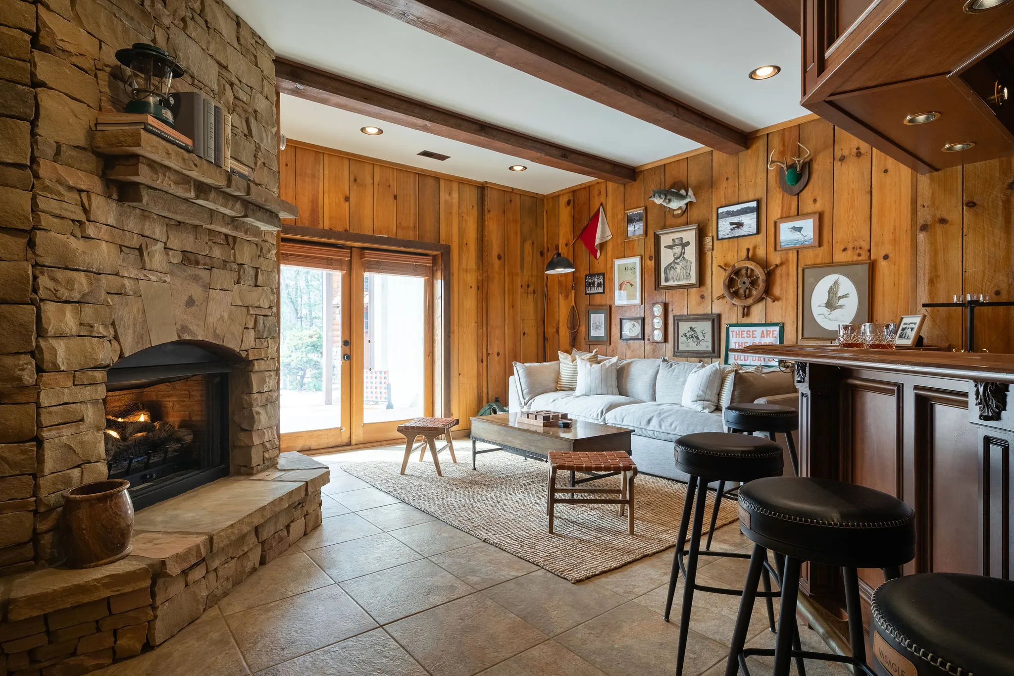 LOWER LEVEL The ultimate lounge, featuring a vintage arcade game, board games, a classic bar, and a gas fireplace. This level also has a queen bedroom with twin bunks and a full bath with a shower. Step outside to a second dining area, lounge space, fire pit, and a large hot tub for stargazing.