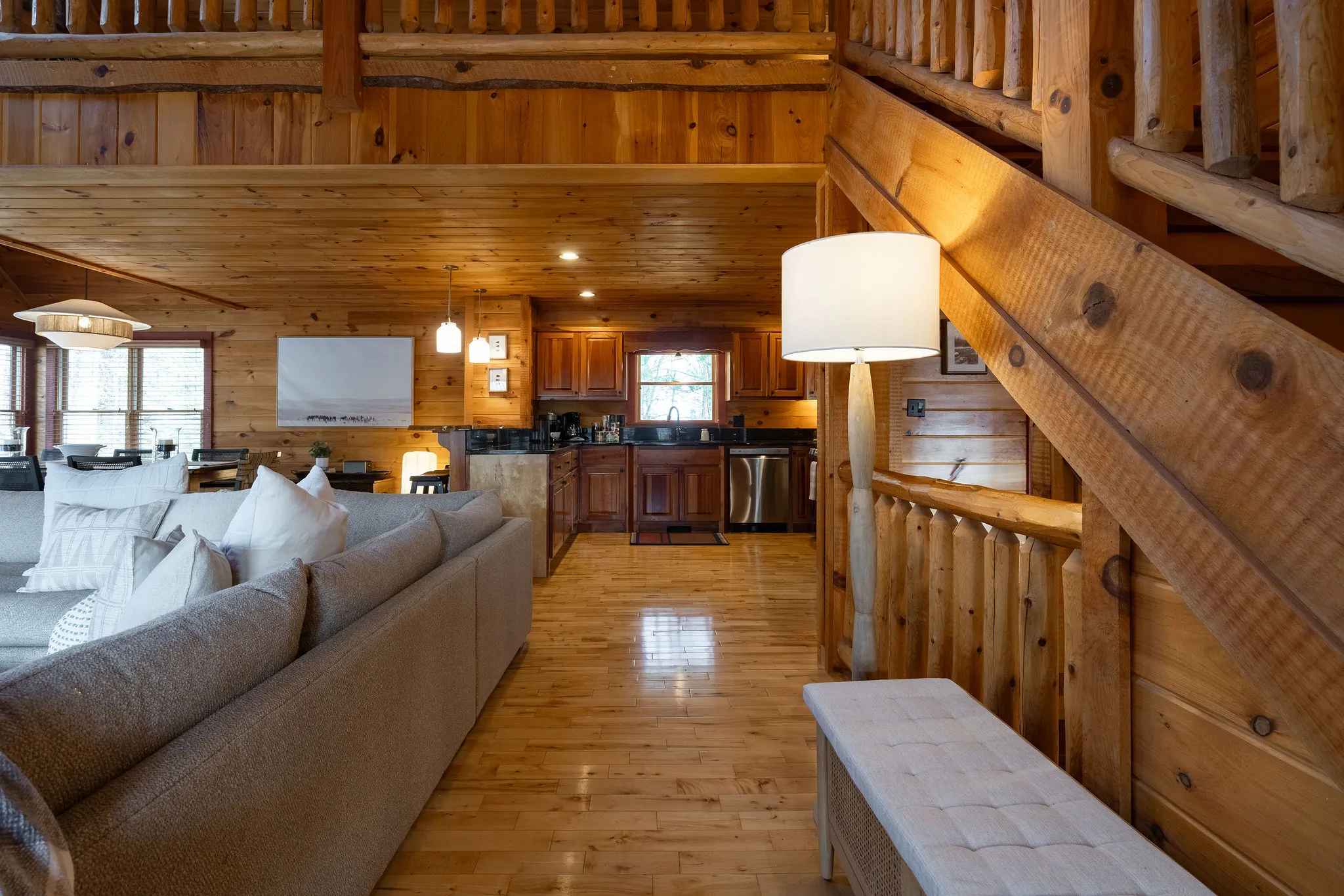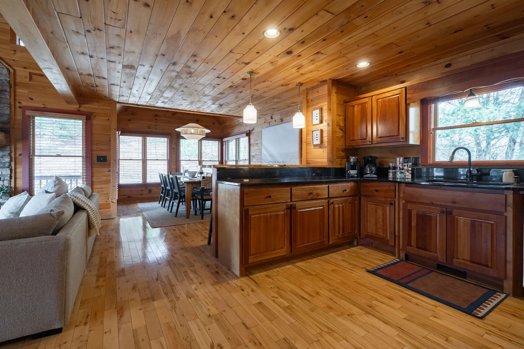 MAIN FLOOR Soaring ceilings, a grand stone fireplace, and a cozy sectional set the scene for relaxation. The fully stocked kitchen includes a coffee bar with ground coffee, creamers, sweeteners, and a starter pack of Nespresso Vertuo pods (bring extras!). A king bedroom and full bath offer convenience, while the expansive porch features rocking chairs, an outdoor dining area, and a grill, all with breathtaking mountain views.