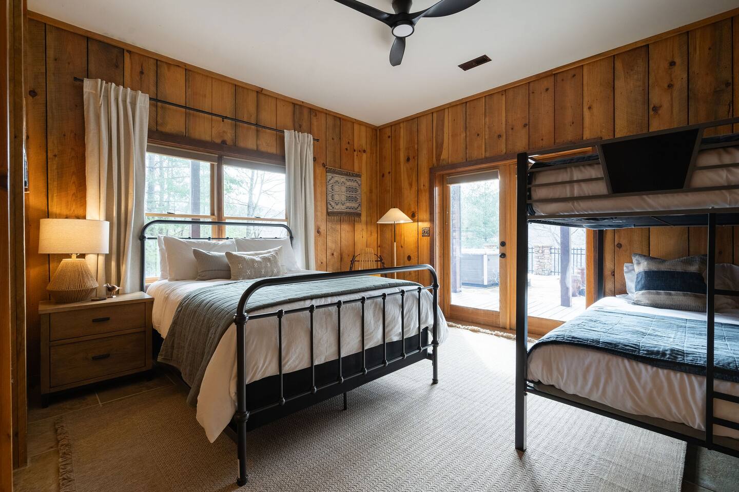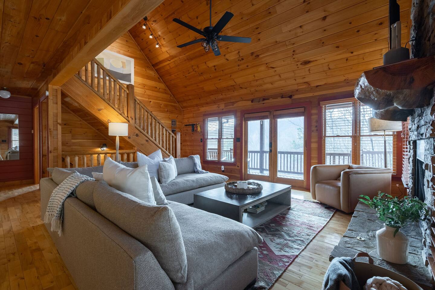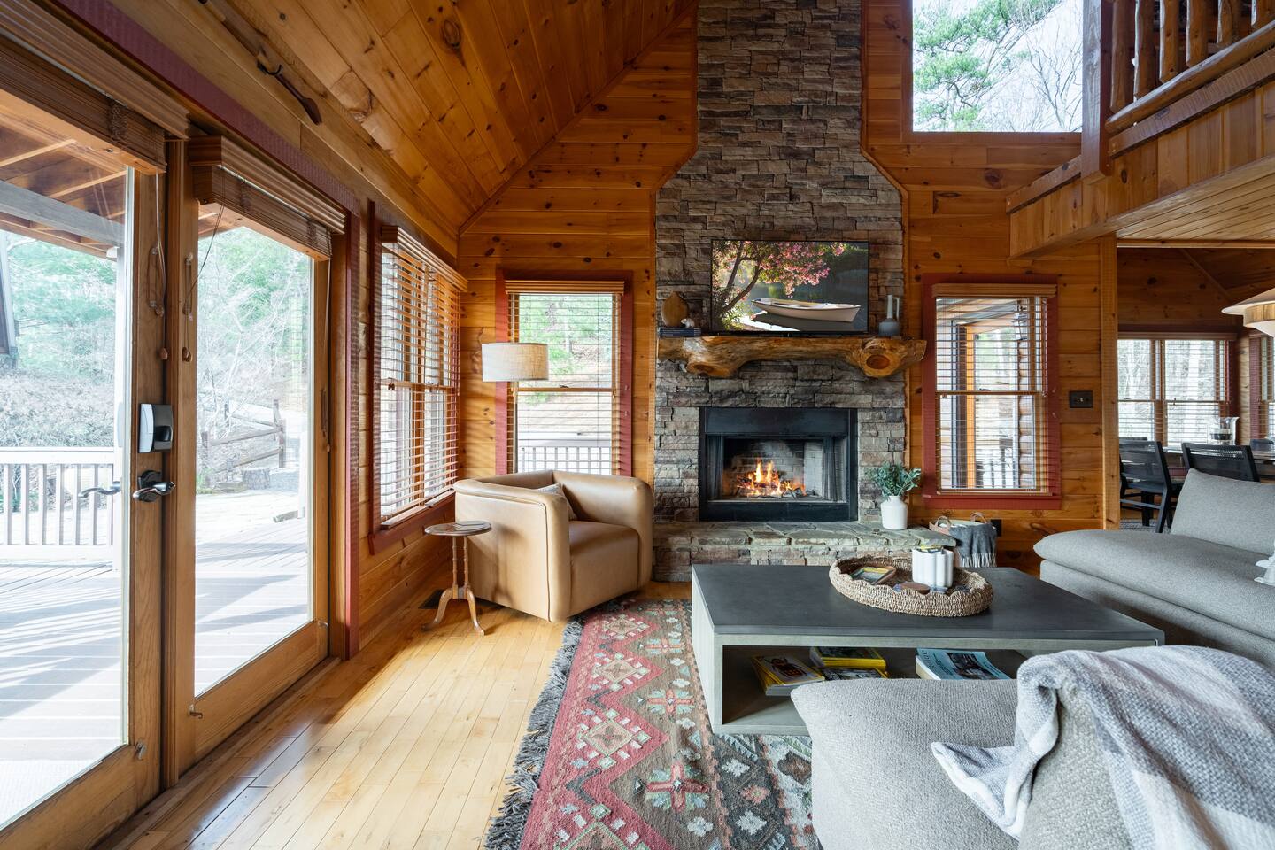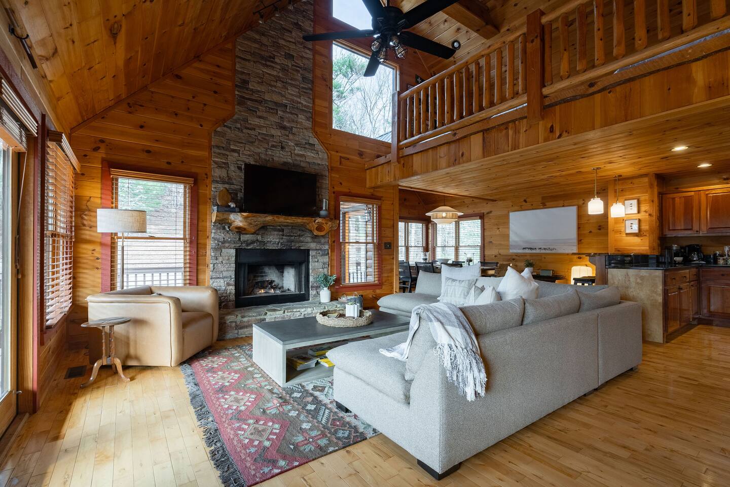 🔥All-paved roads – gated community with no narrow, gravel roads. 🔥Vintage Lounge – Retro-style bar with barware, drink cooler, and arcade game. 🔥Fitness Room – Peloton bike (BYO login), yoga gear, and dumbbells. 🔥Outdoor Retreat – Two balconies plus a stone patio with a hot tub and fire pit, all with stunning views. 🔥Cozy Sleeping Loft – Camp-style loft with three twin beds. 🔥Coffee Bar – Nespresso Vertuo, drip coffee maker, ground coffee, and various sweeteners and creamers. 🔥Cozy Fireplaces – Gas and wood-burning options for warmth and ambiance. 🔥Bluetooth Speaker – Enjoy your favorite music. 🔥Weber gas grill – Propane provided. 🔥Al Fresco Dining – Two outdoor dining areas, one on each level, with scenic views. **Signed rental agreement & $300 security deposit hold required upon booking**